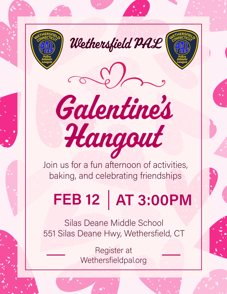 On February 12, 2026, the Wethersfield PAL will be hosting a "Galentines" event at Silas Deane Middle School. During this event, girls will have a fun afternoon of baking and hanging out with friends. We will start the event directly after school and it will go until 5:00 PM. Please follow the links below to register for the event. This event is FREE and open to 7th and 8th-grade students only.